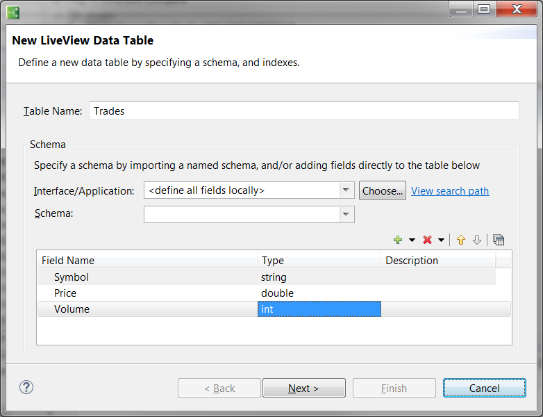 When you create a new LiveView project with → → and select LiveView from the first screen. Clicking opens the New LiveView Data Table wizard in which you can define your first table and its schema. When completed, the Project Viewer opens.