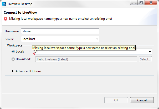 Start LiveView Desktop. This opens the LiveView Desktop connection dialog. Currently, the Local field displays the red X icon. If you hover over the red X, a popup reminds you to enter a new workspace name.