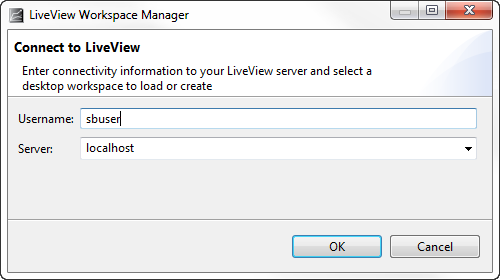Enter your username and the server name for the LiveView Server instance. This example uses username