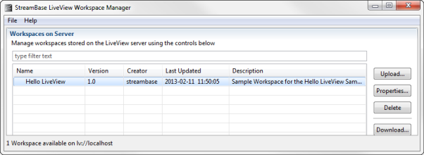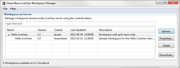 When running LiveView Desktop, your visual layout of views and perspectives, saved queries, and other preferences are saved in a folder on your file system, called the workspace. LiveView Desktop and other LiveView applications default to storing your workspaces under your username's Documents folder, in a folder named LiveView Workspaces. (For example, on a Windows system this would be C:\Users\username\Documents\LiveView Workspaces.) The LiveView Workspace Manager allows you to upload and download existing saved workspaces to a LiveView server instance. LiveView Desktop is capable of downloading workspaces from LiveView server as part of its startup.
