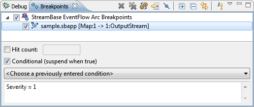 Conditional (suspend when true) lets you specify a StreamBase expression that evaluates to a Boolean value. The debugger only suspends execution at that breakpoint if the expression evaluates to