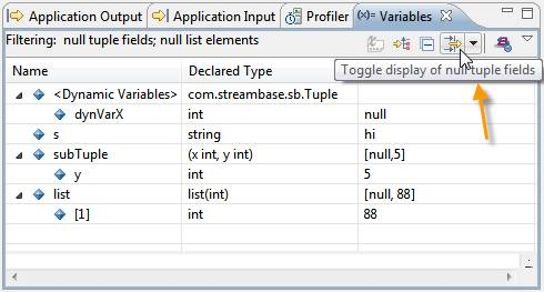 A tuple's fields are displayed in the Variables view any time the EventFlow application is suspended and the execution point is at an arc or output stream. A thread is typically suspended at an arc or output stream after an arc breakpoint was hit, or after a debugger step operation ends at an EventFlow arc or output stream.