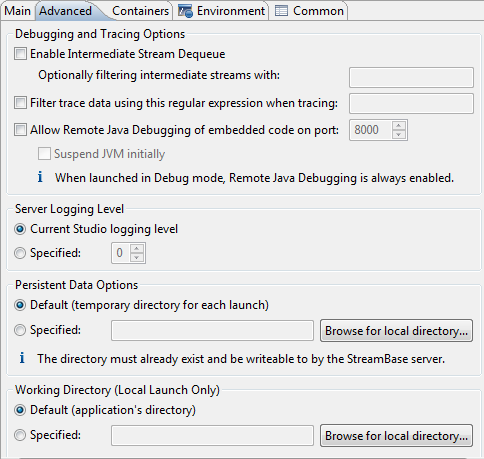 --datadirwhen running sbd from the command line. Use the default or specify an existing directory, accessible to and writable by StreamBase Server. - Working Directory