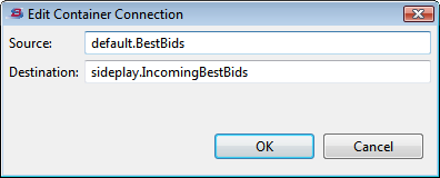 Click the button, and specify the Source and Destination streams, using stream names qualified with the container name, as shown in this example: