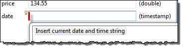 To enter a timestamp value, press Ctrl+Space with the cursor in a timestamp field (illustrated by the red line in the following example). Studio prompts with an autocompletion message as shown below. Select the message and press Enter to fill the field with the current date and time formatted as a timestamp string.
