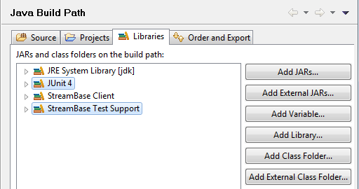 (Alternative: if you select only JUnit4, StreamBase automatically includes the required StreamBase Client and Test Support libraries.)