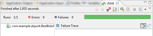 BestBidsAsks.sbappmodule, sends the specified tuple to input streamNYSE_Feed, and compares the output emitted from output streamBestAsksto the tuple you specified for theExpecterobject.The JUnit view is brought to the foreground in the bottom pane. Look for the long green bar that indicates that the test passed.