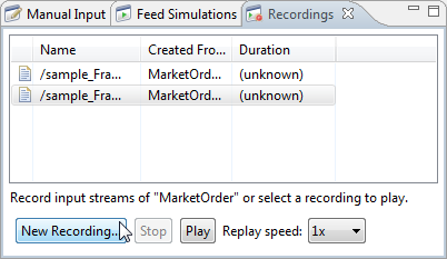 StreamBase allows you to record data enqueued onto one or more input streams, and subsequently play the recorded data back on the same application, at the original speed or an accelerated speed. Among its many uses, this feature allows you to test alternative processing strategies in the StreamBase operators, to see the effect of changes, given the same set of recorded data. This topic explains how you can use the graphical Recordings View in StreamBase Studio, or the corresponding, command-based sbrecord and sbfeedsim features in a terminal windows.