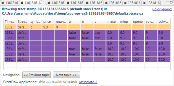 Browse the currently open trace file using the Browse pane. Set the timestamp index slider to view the contents of tuples emitted in the time frame indicated. The default is the first tuple in the file.