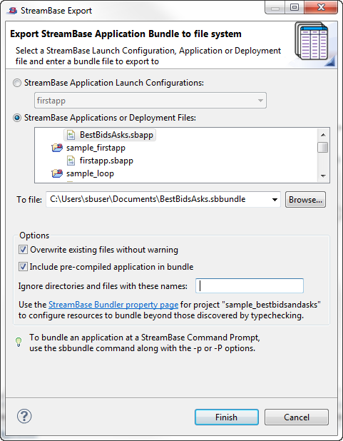 When creating bundle files in StreamBase Studio, the Export Bundle dialog offers the option Include precompiled application in bundle. With this option enabled, the Export Bundle dialog generates a precompiled application from the top-level application and packages both application file and its precompiled version into the bundle.
