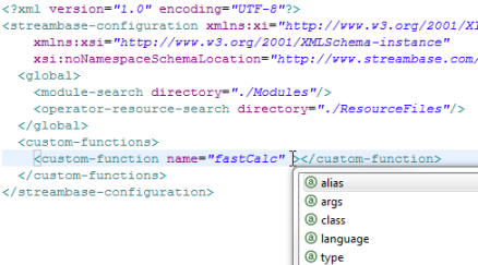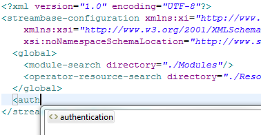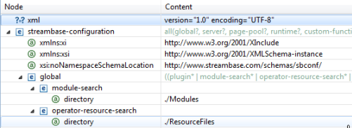 <streambase-configuration>element. These declarations are what direct the Editor to Studio's internal copy of the configuration file schema. Do not edit or remove the namespace declarations, or Studio may not be able to provide schema-aware assistance while editing. - Source View