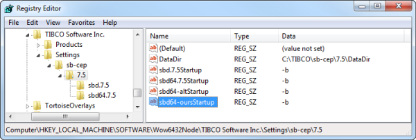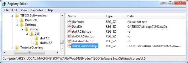 regeditor another registry editor. Navigate to the location described in StreamBase Registry Keys on Windows and locate the startup entry for the newly added service. For this example, we added a service namedsbd64-ours, so we should find a new registry key namedsbd64-oursStartup: