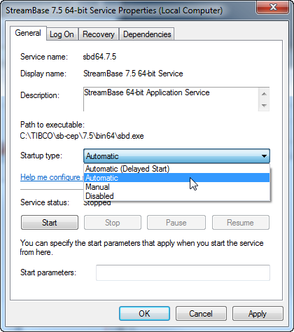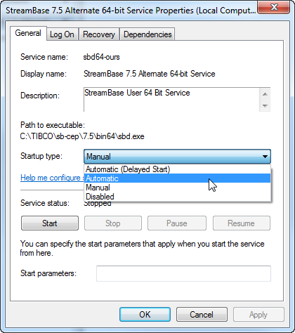 To activate a default-installed StreamBase service so that it starts at Windows boot time: