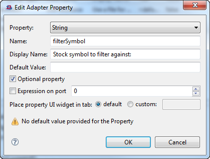 Specify one or more properties that can be set or modified by users of your adapter to control its operation. For each property you specify, the wizard generates code to place a control in the Adapter Properties tab of the Properties view for your adapter's icon. See Adding Adapter Properties for details on using this section.