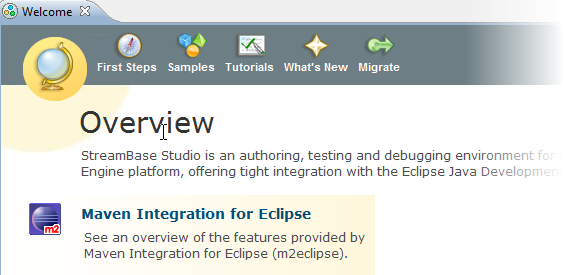 When Studio restarts, it opens onto the Welcome Overview page. Click the item, as shown below, for more information about m2e.