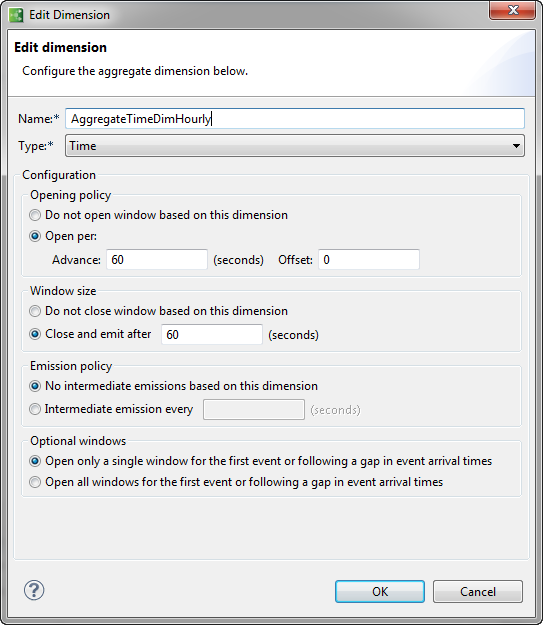 An aggregate is set with the dimension for window opening and closing to 60 seconds (Advance 60, Close and Emit 60), with no intermediate output.