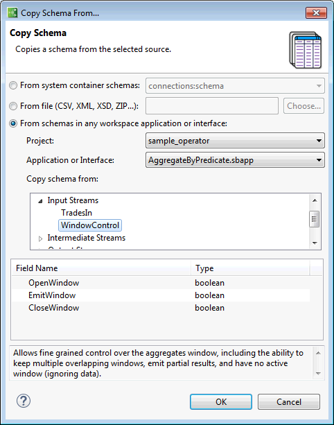 Use the Copy Schema From dialog to insert an existing schema into the Fields grid of an Edit Schema tab in the Properties view. Copy Schema From is also available for arcs when StreamBase cannot automatically determine the schema to use (such as when there are multiple arcs between two components).