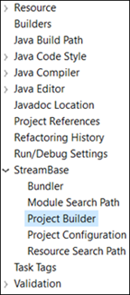 To open the Project Builder panel, open the Project Properties dialog for the project of interest, as described in StreamBase Project Properties. Select Project Builder from the contents column on the left.
