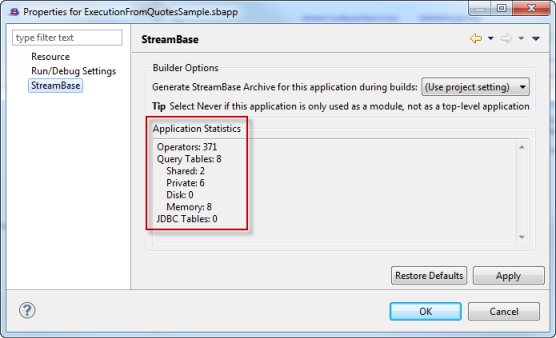 The Application Statistics section shows the following information about the currently selected EventFlow or StreamSQL module, including all its referenced submodules: