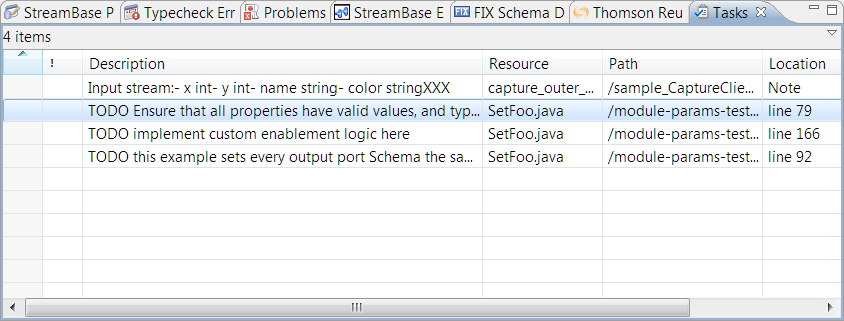 StreamBase Studio can take advantage of the Tasks view provided by Eclipse. To add a reminder entry in the Tasks view, place one of the following case-sensitive trigger strings in the text of a Note or Description field in an EventFlow module: