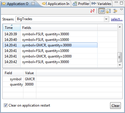 BigTradesfrom the Stream drop-down. Verify that the quantity value is always above 10000 for entries in the list.Tip