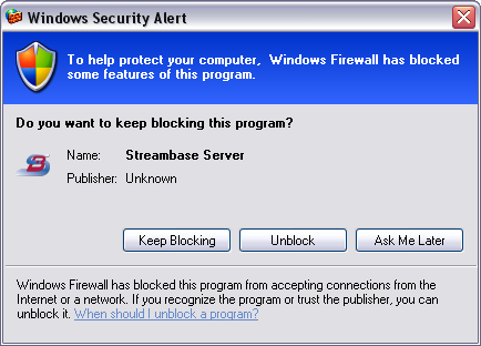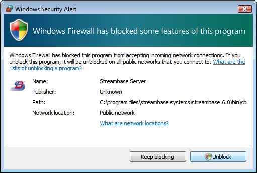 When you run a StreamBase application in StreamBase Studio (for example, by launching one of the demos in the SB Demos perspective), StreamBase Studio makes a local network connection to a StreamBase Server instance. When this connection is first attempted, your firewall or Internet security software may issue a warning message. Always select the Allow or Unblock option that allows StreamBase to make the connection.