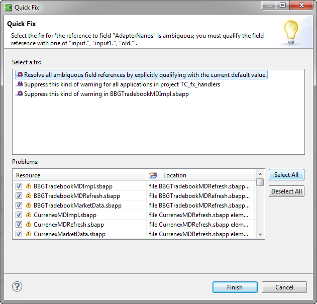 input.to all unqualified fields (which mimics the behavior of StreamBase Studio 7.3.x), in the Quick Fix dialog, select the line Resolve all ambiguous field references ... in the top pane, click , and then click , as shown in the following illustration.