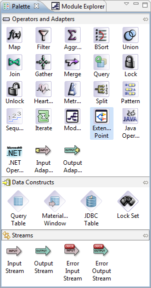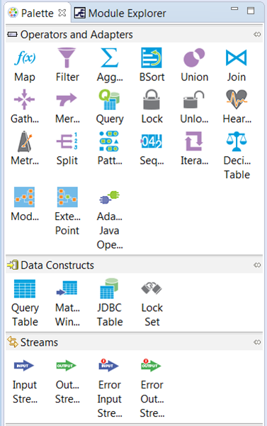 In release 7.4, the palette icons for Java Operators, Input Adapters, Output Adapters, and the .NET operator have been removed. Instead, find all those items by dragging the icon (highlighted above left) to the canvas and selecting the operator or adapter you need by selecting it in the Global folder in the Insert Operator or Adapter GUI and then clicking .