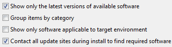 When installing the Studio plug-ins into Eclipse, TIBCO strongly recommends doing so while your machine has open access to the Internet, and with the Contact all update sites check box selected on the Available Software Install dialog.