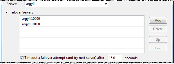 The following dialog fragment shows LiveView Desktop configured to connect to a primary LiveView server running on server argyll on port 10080 (the port number is not shown when it is the LiveView default port, 10080). Failover servers are expected to be running on argyll at ports 10090 and 10100.