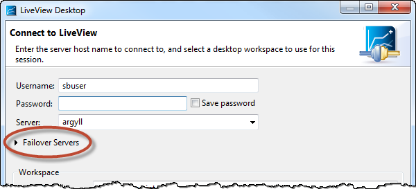When you click the button in the Connect to LiveView dialog, Desktop attempts to connect to the URI of the primary server specified in the Server field. You must specify a valid LiveView URI for a primary server in order to use the failover feature. On its initial connection attempt, LiveView Desktop always tries to connect to the primary server first, and that connection must succeed or fail.