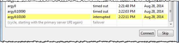 Use this button to skip the current reconnection attempt in the list of failover servers, and try connecting to the next server in the list. Use when you know that one or more failover servers are down, to bypass the default 15 second timeout period.