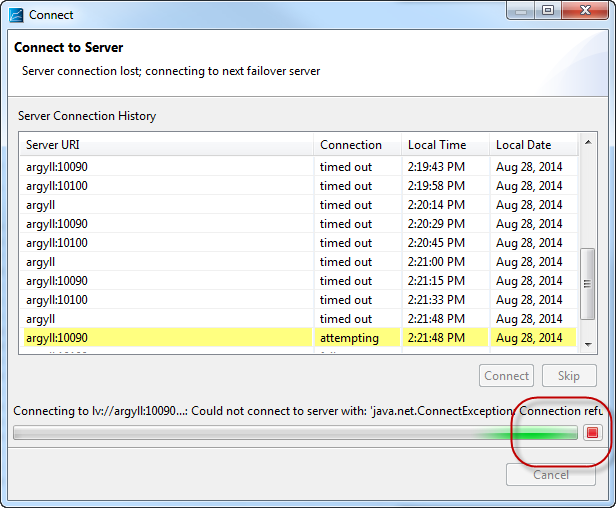 After a default 15 seconds of trying, LiveView Desktop tries to connect to the second failover server in the list, if present. When connections to all failover servers have been attempted for the default 15 seconds each, Desktop tries the primary server again. Connection attempts continue to cycle in sequence until a server responds and allows the connection, or until you interrupt the cycle with the button.