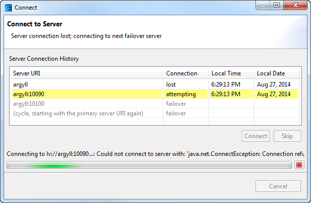 After an initial successful connection, if a running primary LiveView server stops responding, LiveView Desktop shows a line like the following in its status bar, then opens the Connect to Server dialog to attempt a connection to the next failover server in the list. If all goes well, with fast servers and an uncluttered network, connecting to the next failover server can occur so quickly that there is no time to show the dialog.