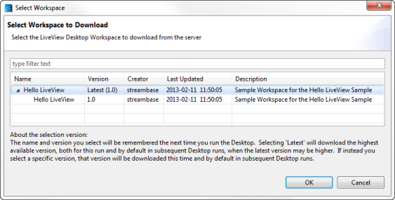 Select the workspace named with the Version set to Latest from the table. Note the information given in the Select Workspace dialog: the name and version you select will be remembered the next time you run the Desktop. In this case, you have elected to download the highest available version of the workspace.