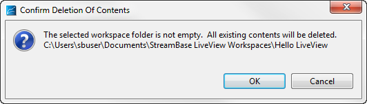 LiveView Desktop remembers the settings that you chose in the startup dialog. The next time you open LiveView Desktop, the same options are selected. This is important to note. When you choose to download a workspace from the server, LiveView Desktop will default to putting the newly downloaded workspace in the same location as the last workspace that you downloaded and overwrite any workspace that exists in that location. For example, if you close LiveView Desktop and re-open it without changing any settings, you will see the following message: