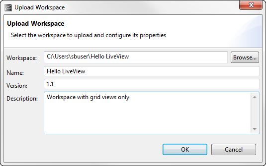 Now you can use LiveView Workspace Manager to upload your local workspace to the server. The LiveView Workspace manager requires a separate installer from LiveView Desktop. Check with your system administrator if you do not have the Workspace Manager installed.