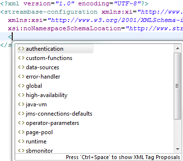 The Configuration File Editor is a validating XML editor that is aware of the schema that defines the XML syntax of StreamBase Server configuration files.