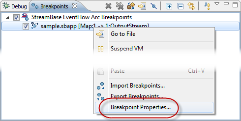 Conditional (suspend when true) lets you specify a StreamBase expression that evaluates to a Boolean value. The debugger only suspends execution at that breakpoint if the expression evaluates to
