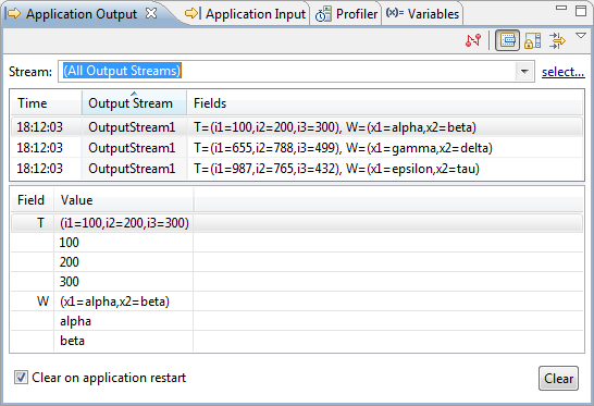 For the example CSV files above, the following Application Output view shows that the tuples fed to the input stream were interpreted as expected, and all sub-fields were filled with data: