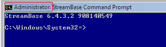 A StreamBase Command Prompt opened with administrator privileges shows the word Administrator in the title bar, and opens by default in the Windows\system32 directory instead of the StreamBase installation directory.