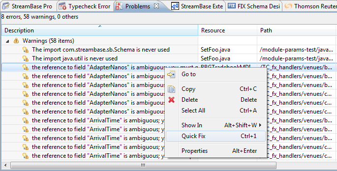 To see all warnings in old applications when updating your workspace or after importing a project with Query operators that contain ambiguous field names, click the Problem view in the EventFlow Editor to see the warnings. To fix them, select a warning by right-clicking it and choose Ctrl+1, as shown here.