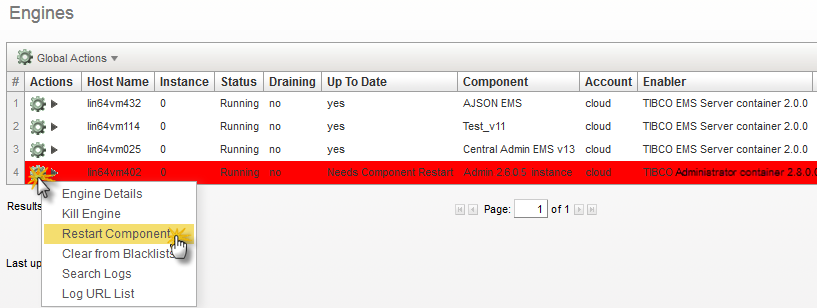 Engines page and those stacks that used the upgraded component is displayed in red if they require a component restart.