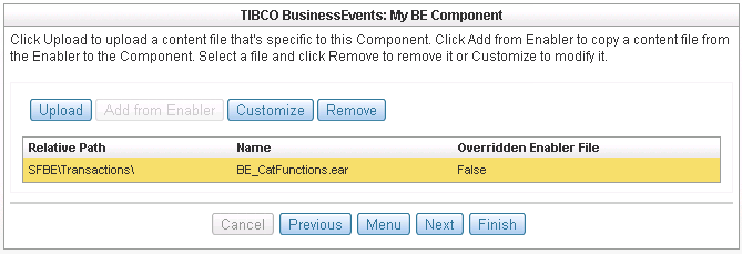 Add files associated with the TIBCO BusinessEvents® component that might be required for the component to be run according to design. An enterprise archive (EAR) file might be uploaded to a specific relative path for runtime component use.