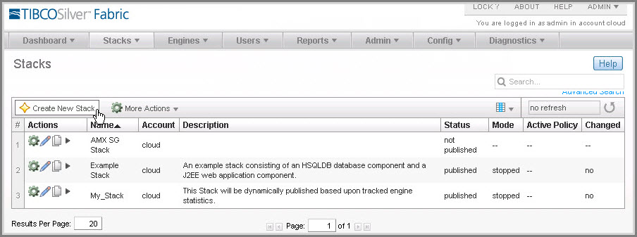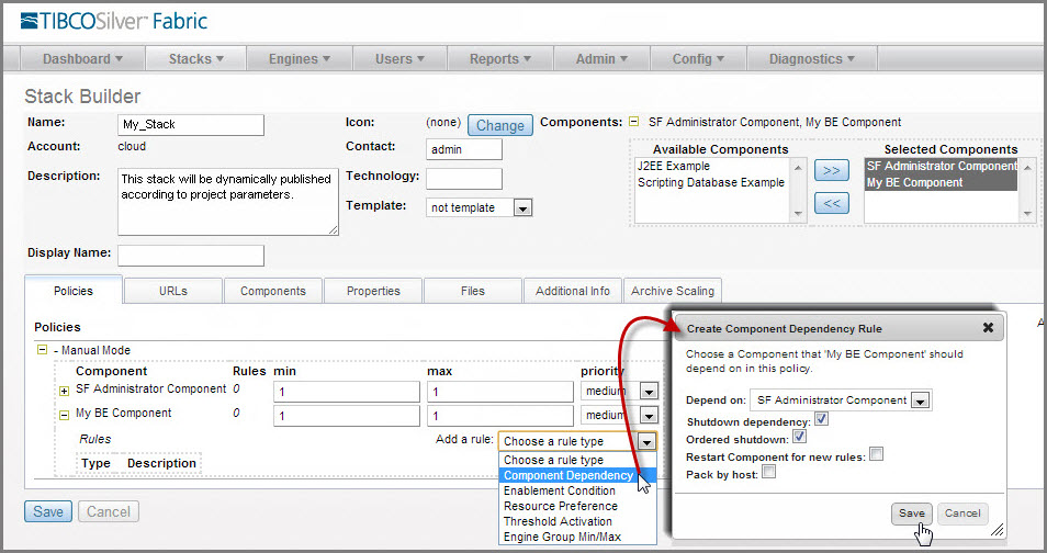 Components are deployed within a stack. A stack for TIBCO Silver Fabric Enabler for TIBCO BusinessEvents normally contains a single TIBCO Administrator component or TIBCO Enterprise Administrator component, and one or more TIBCO BusinessEvents components. A stack can be created with a single component and it could be run in stand alone configurations. After creating and publishing the TIBCO Administrator or TIBCO Enterprise Administrator, and BusinessEvents components, you can create a complete stack for TIBCO Silver Fabric Enabler for TIBCO BusinessEvents.