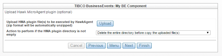 - Click Upload and choose a file to upload. The file uploaded is located in the $EngineWorDir/fabric/hmaplugin directory. It is copied to the hma_plugin_dir between the AddMachineAction() and StartHawkAgentAction() lifecycle events.