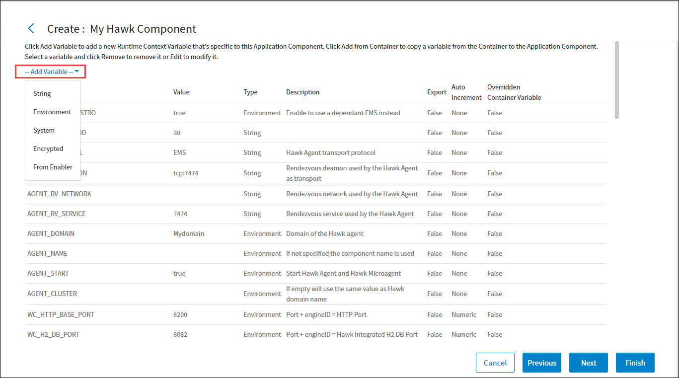 Encrypted variables may be added and changed in the component to define and set runtime specific context variables.