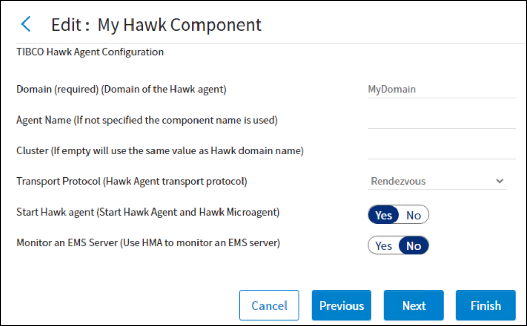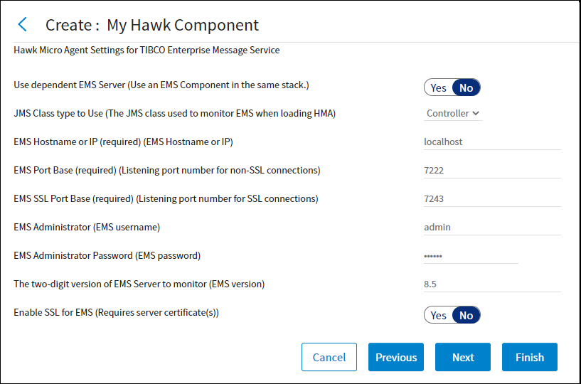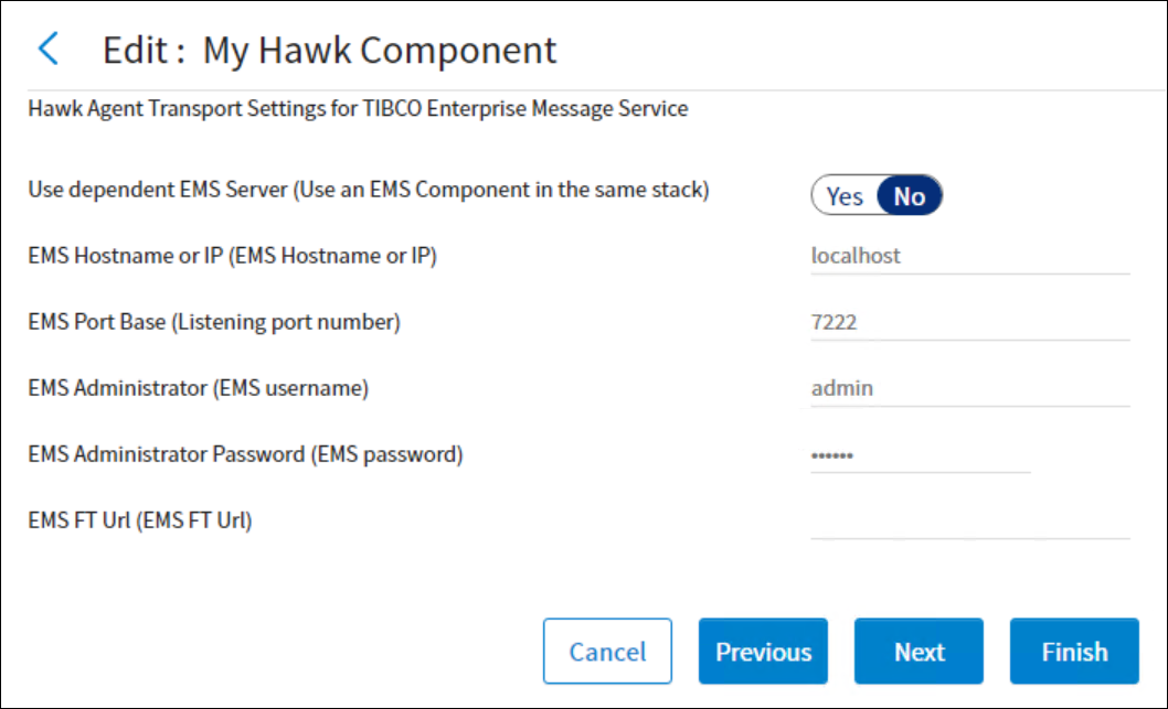Hawk Micro Agent Settings for TIBCO Enterprise Message Service page to expose configuration settings defining how your TIBCO Hawk Component will connect with a TIBCO EMS. Refer to