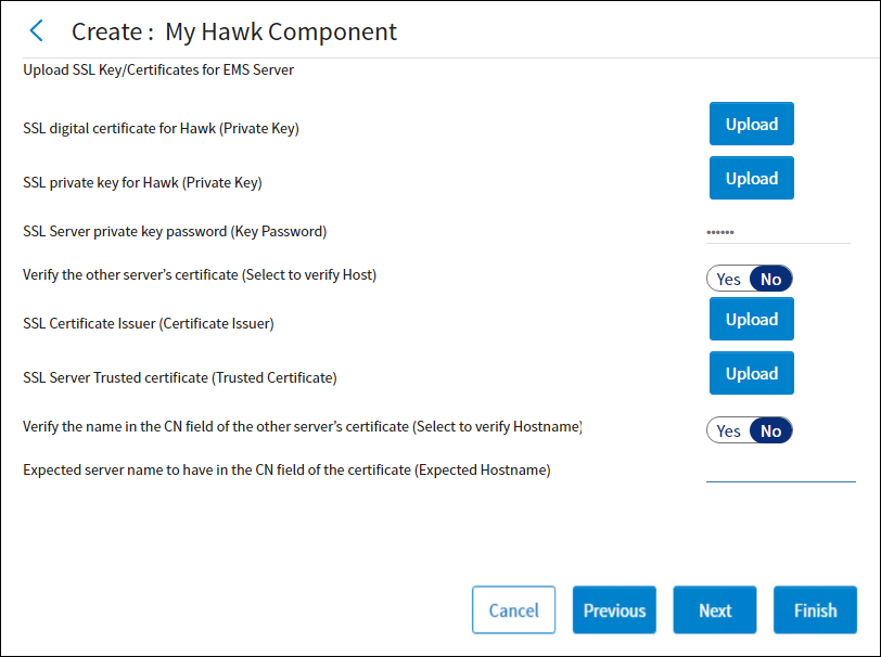 Upload SSL Key/Certificates for EMS Server page to allow you to configure TIBCO Hawk to use SSL when monitoring or controlling TIBCO EMS.