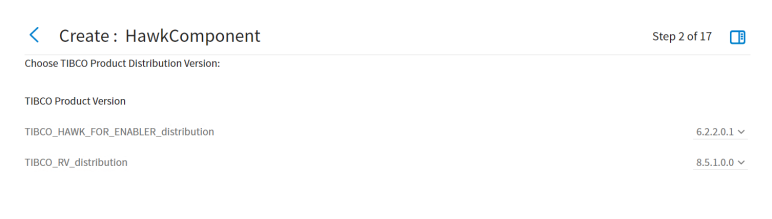 Select a version of each of the installed distributions. It is a good practice to use the latest version of a product distribution. For more information, see the TIBCO Silver Fabric Enabler for Hawk Readme for more information on supported distributions. The product versions that are displayed are compatible with the component being defined.